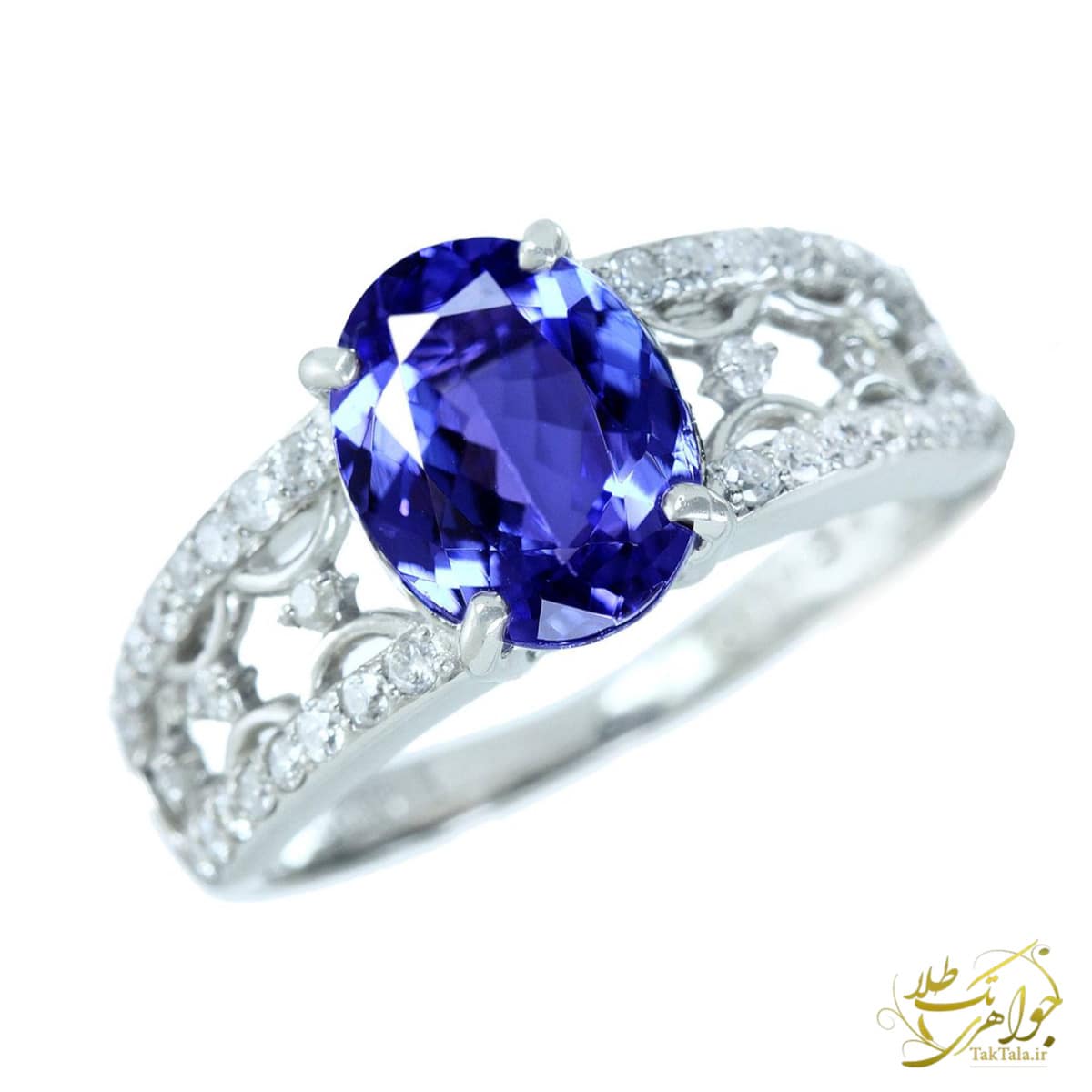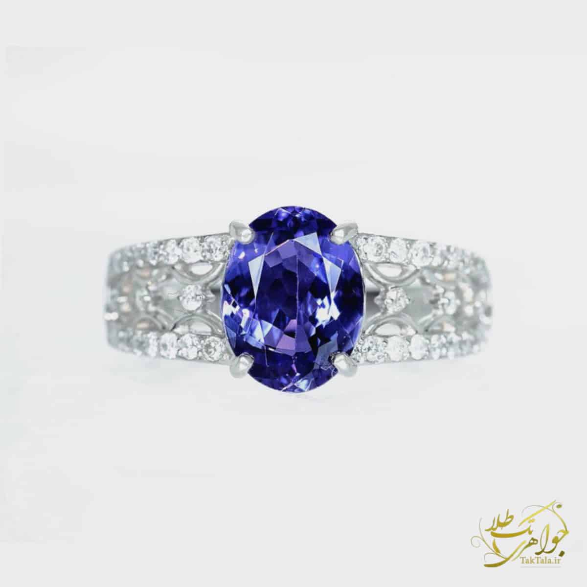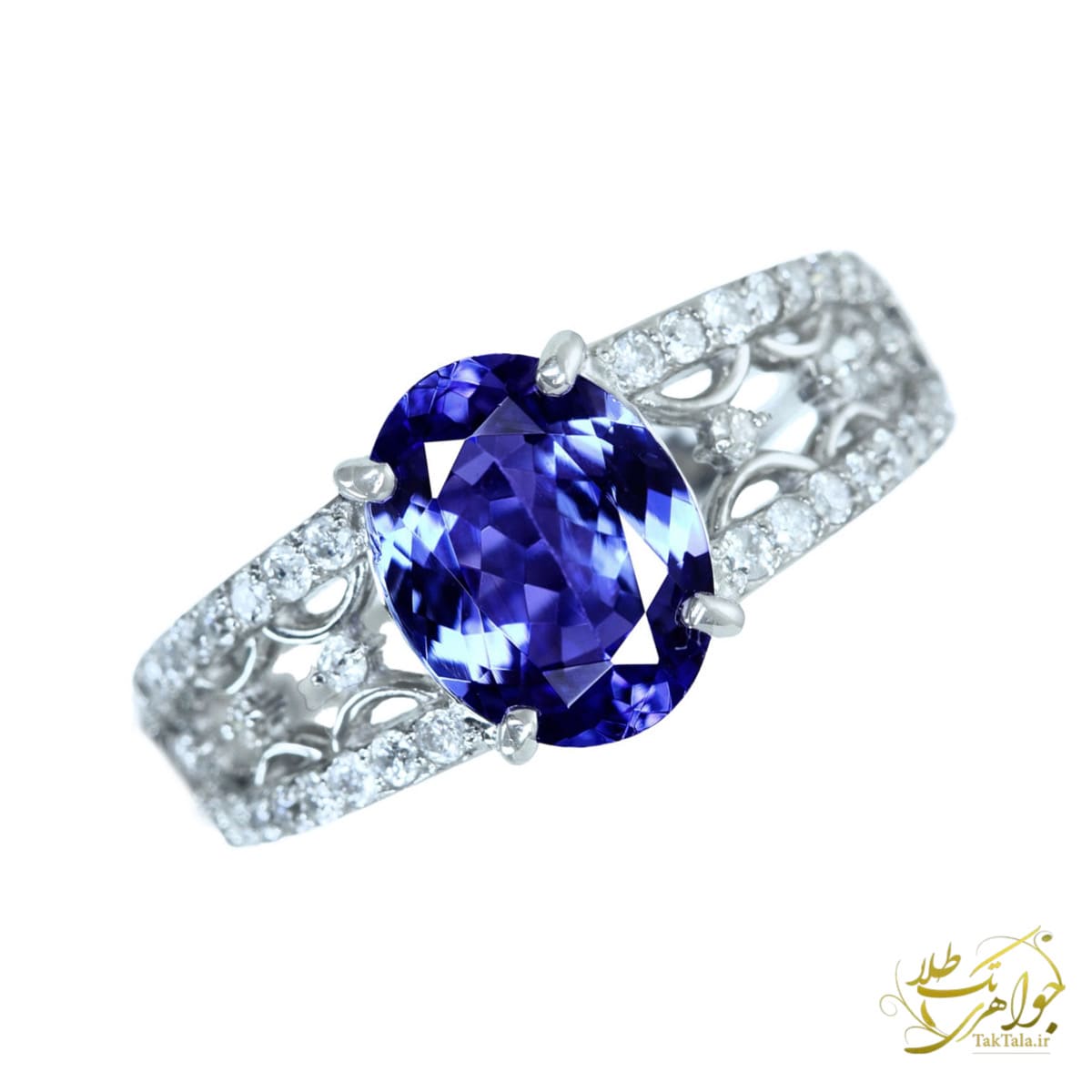 انگشتر طلا و جواهر تانزانایت زنانه و نگین برلیان، به وزن خالص ۳٫۵ گرم طلای سفید ۱۸ عیار و الماس تراش برلیان سفید و پاک.