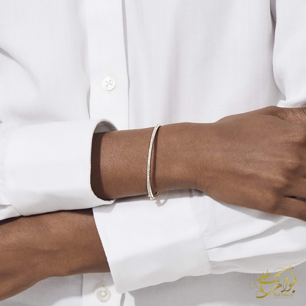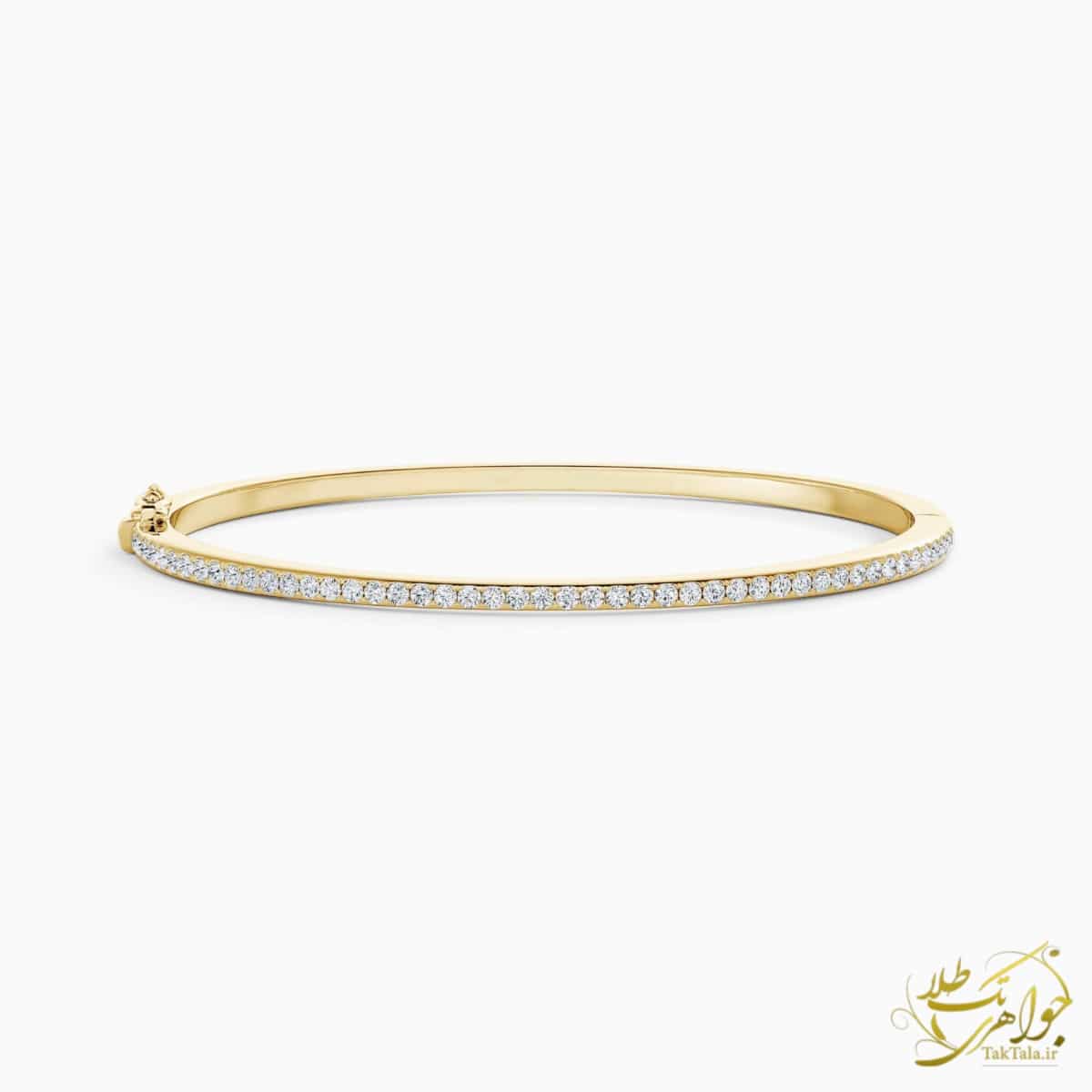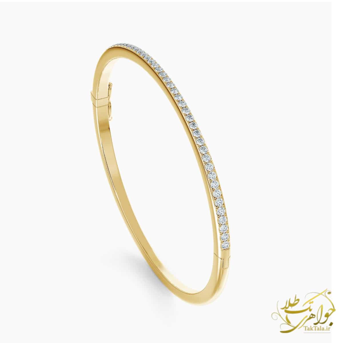 دستبند طلای زنانه با نگین برلیان سفید اصل، به وزن خالص ۷ گرم طلای زرد ۱۸ عیار، و الماس تراش برلیان سفید و پاک.